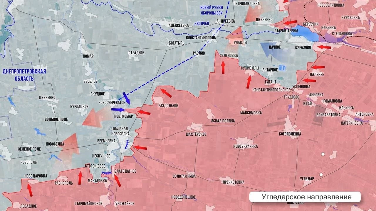 На Покровском фронте МО заявило об освобождении села Новый Труд. Ресурсы противника сообщают, что армия России практически освободила соседнее Даченское. ВСУ сохраняют присутствие на восточных окраинах, ближних к Лысовке, где наши усилили натиск. Западнее наши бойцы штурмуют Песчаное от которого вышли к северным окраинам Волково. Упорные бои идут по линии Волково-Соленое-Нововасилевка. Между Нововасилевкой и Новоелизаветовкой штурмовики продвинулись широким фронтом на глубину от 1 до 3 км. Со стороны Новоленовки - ВС РФ мощно продвинулись в направлении Украинки. Значительную территорию взяли под контроль северо-западнее Зари - это позволит выйти в тыл гарнизонам в Славянке и Украинке. Упорнейшие столкновения в районе Сонцовки и Петропавловки за выход к трассе на Андреевку.