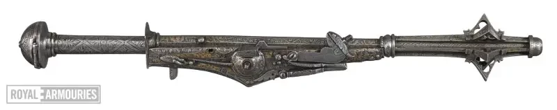 Ствол пистолета образует древко булавы, головка которой имеет шесть заостренных фланцев, каждый из которых пронизан трилистником. Замок представляет собой колесцовый замок и имеет поворотный предохранитель, взаимодействующий с курком. Рукоять имеет фланцевую гарду над головкой и полусферическое навершие, которое представляет собой откидную крышку для гнезда в полой рукояти. Всё оружие протравлено и позолочено листвой; клеймо изготовителя выбито на замочной пластине и повторено на стволе. На стороне, противоположной замку, имеется крюк для крепления у седла.