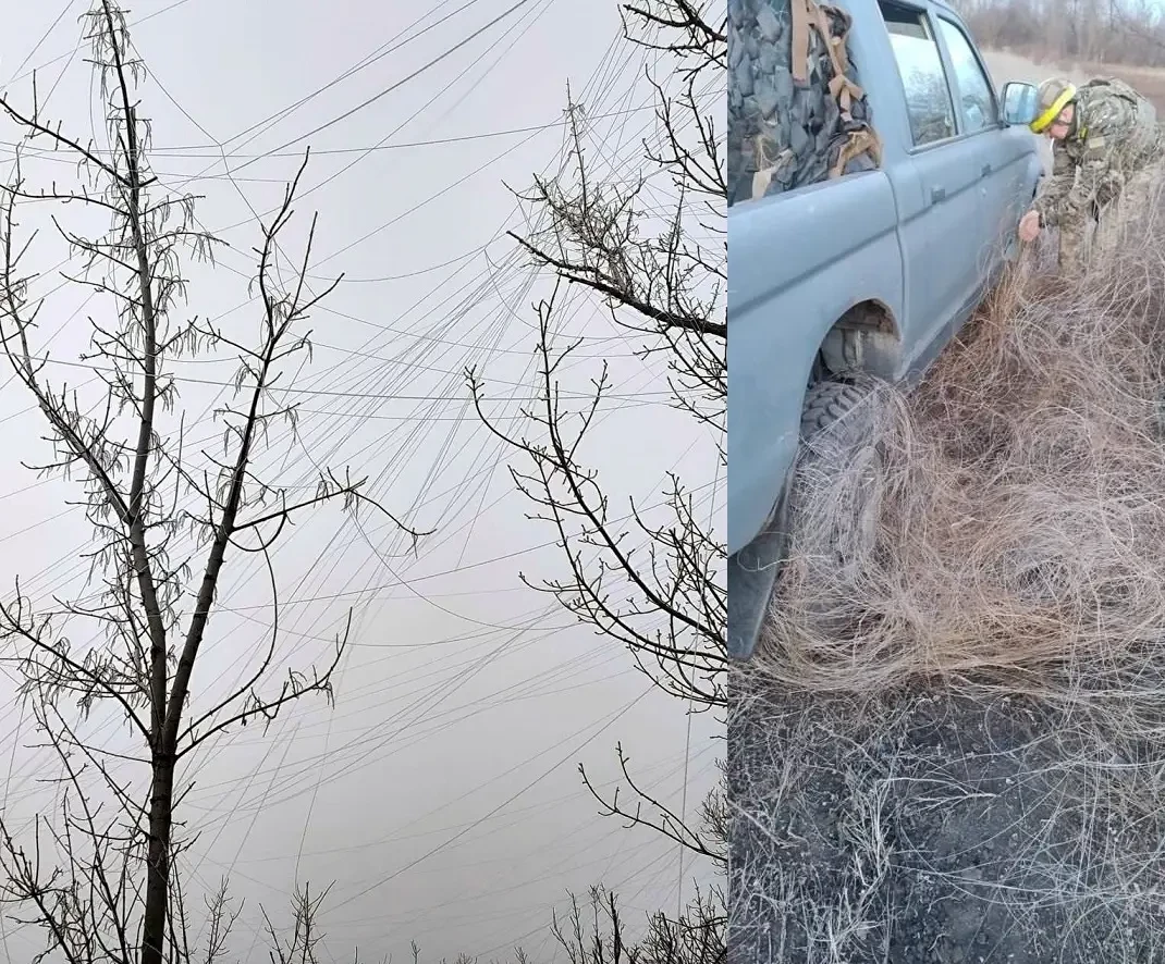 Паутина от российских дронов, управляемых по оптоволокну
