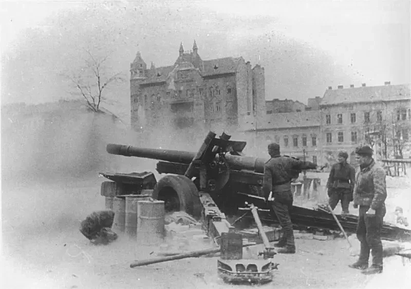 Советские артиллеристы ведут огонь из 152-мм гаубицы МЛ-20, Будапешт, площадь Кальвария, январь 1945 года