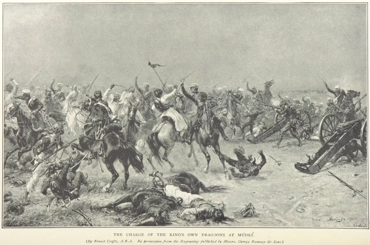Сошлись в битве... Ну ладно, ладно. Хотя для сражения, в котором с одной стороны командует человек, ментально застрявший в Наполеоновских войнах, а с другой стороны — пара британских шпионов, название вполне подходящее. Англичанами командовал генерал-лейтенант сэр Хью Гоф, человек упрямый и лишённый воображения, уверенный, что штыковая атака — универсальный тактический приём, при помощи которого можно решить любую задачу. Войска под его командованием достигли деревни Мудки во второй половине дня. Армия ОИК реквизировала в деревне зерно и принялась готовить обед.