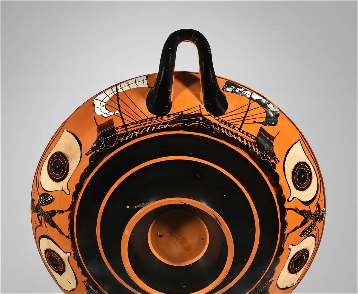 А это греческий килик – чаша для питья, 520 г. до н. э. И на ней изображены корабли того времени. Метрополитен-музей, Нью-Йорк