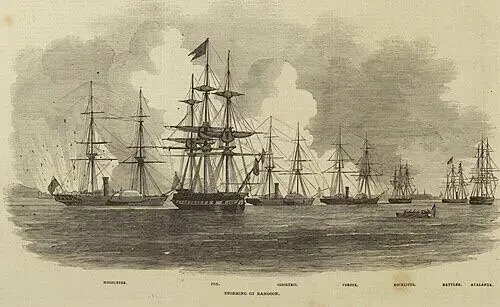 На рассвете 9 января 1852 года британская эскадра стала спускаться вниз по Иравади. На буксире колёсного пароходофрегата «Гермес» шла яхта императора Бирмы. Когда из-за частокола крепости раздались мушкетные выстрелы, флагман Ламберта, 46-пушечный винтовой фрегат «Фокс», дал бортовой залп. Следом огонь открыл пароход «Флегетон». Бой продолжался два часа: англичане топили в гавани Рангуна всё, что плавало. Из военных кораблей на дно была отправлена бирманская канонерка с большой пушкой и 60 моряками на борту. Всего британцы отчитались о 300 убитых и стольких же раненых бирманцах. А Ламберт, без которого война не началась бы, отписал секретарю правительства Индии Хиллади: