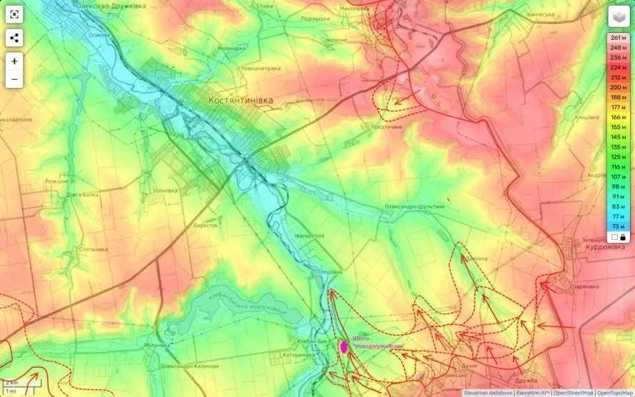 Одновременно ВС РФ наступают на Константиновку с нескольких направлений: с юго-запада по трассе Н20 через Новооленовку, с юга из Романовки и с юго-востока по трассе Т0516 из Дзержинска (ранее Торецк).