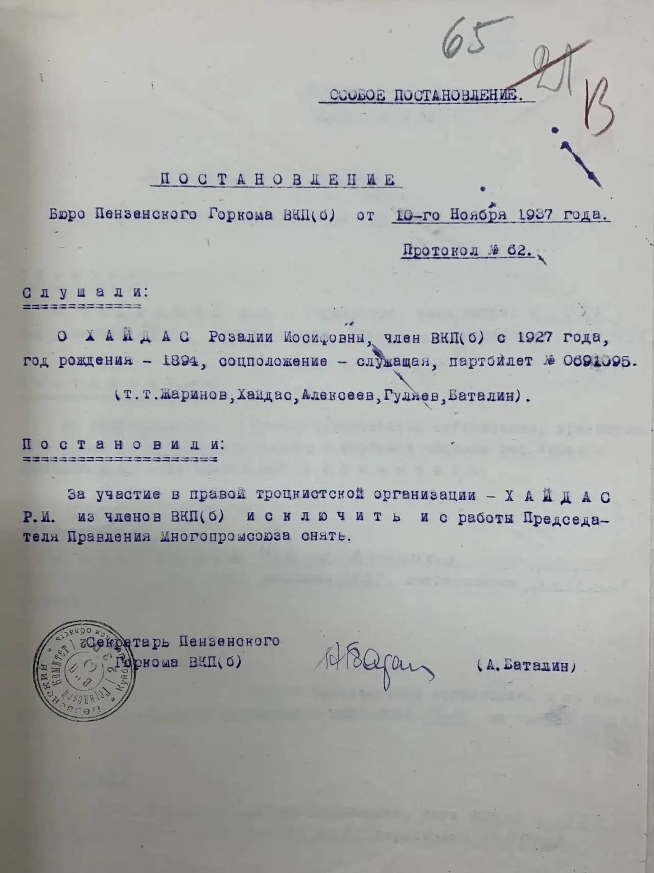 Вот так в то время выглядели справки Бюро горкома ВКП(б) об исключении из партии
