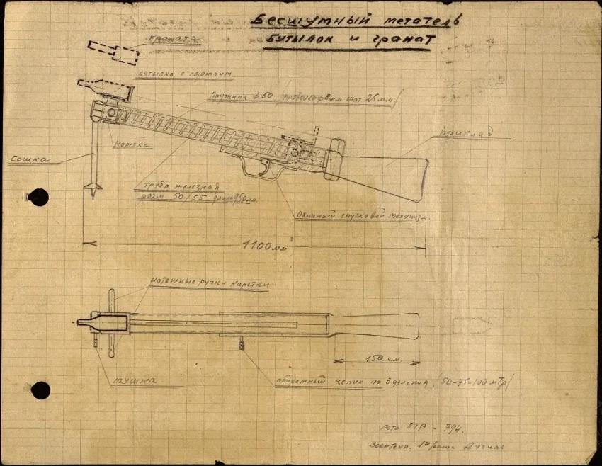 Многое из хорошего придумано до нас. В феврале 1942 года воентехник 1-го ранга 794-го полка 227-й стрелковой дивизии Дугиль Георгий Александрович предложил пружинный метатель для прицельного метания гранат и бутылок с зажигательной смесью на дальность до 100 метров. По его идее, пружинный метатель должен был дать больше шансов противотанкистам выжить при отражении танковой атаки.