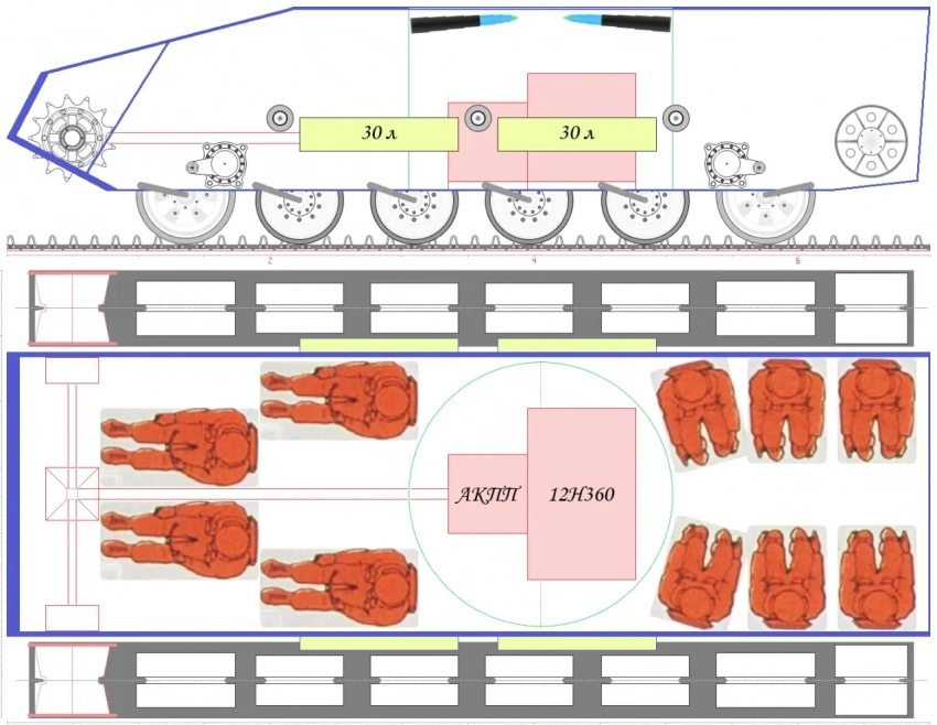 В целях экономии заброневого пространства ТБМП и повышения устойчивости к возгоранию машины ограничим запас хода 300 км (расстояние от Севастополя до Мелитополя по трассе 326 км, а по прямой – 289 км). Такое решение хорошо коррелируется с аналогичной характеристикой танка Т-80, который считается «прожорливым» (запас хода по шоссе 350 км, по пересечённой местности – 250 км). То есть при совместных действиях танков и ТБМП логистика будет практически одинакова. Удельный расход топлива у двигателя 12Н360 ненамного, но меньше, чем у двигателя УТД-29 с БМП-3.