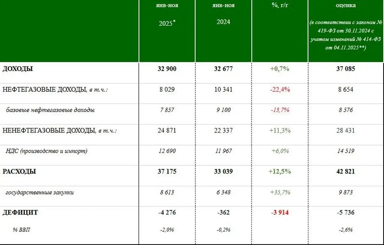 По итогам января-ноября 2025 года федеральный бюджет сложился с дефицитом в размере 4 276 млрд рублей, что на 3 914 млрд рублей выше уровня аналогичного периода прошлого года.