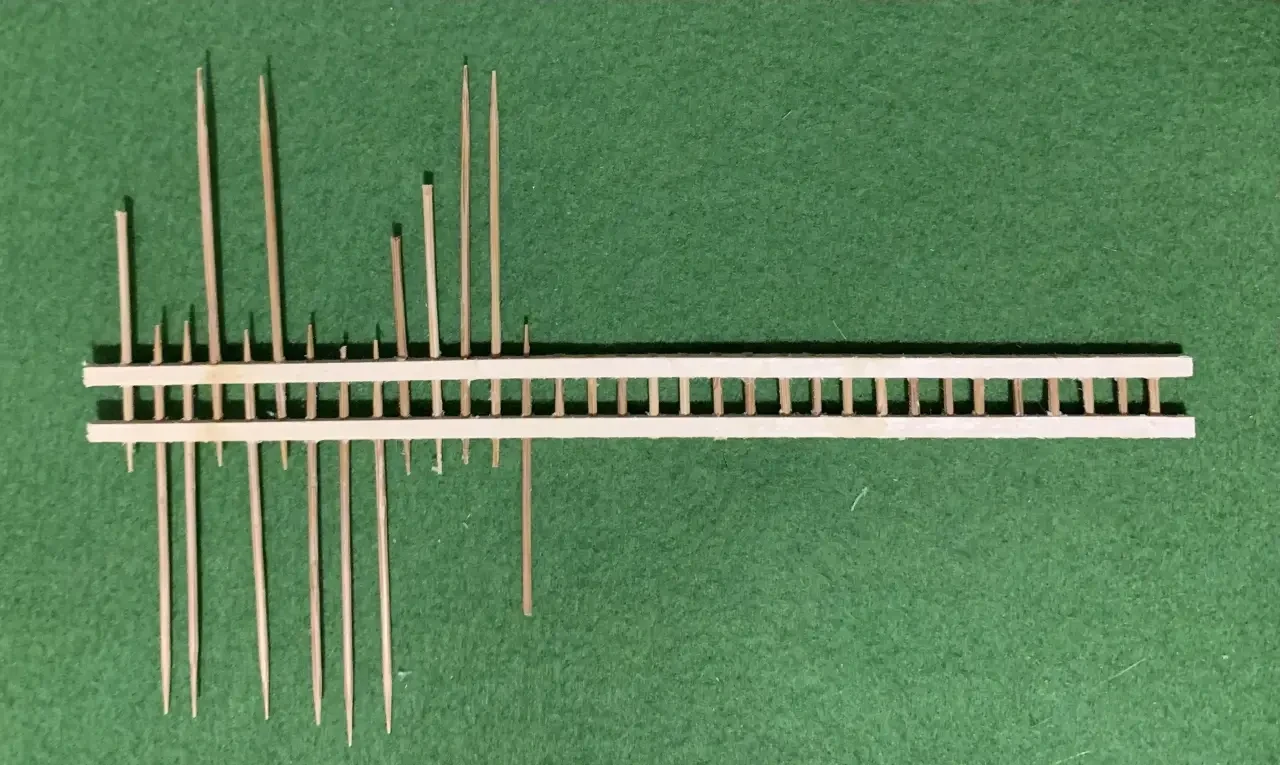 Наиболее трудоемкая деталь башни – лестница, что ведет на ее верхнюю площадку. Для ее изготовления потребуются две рейки квадратного сечения от компании «АВ-модель», в которых с шагом 5 мм просверливаются отверстия диаметром 1 мм. В масштабе 1:72, в котором как раз и делается наша модель башни, высота лестницы составит 170 мм. В отверстия вставляются зубочистки, смазанные клеем.