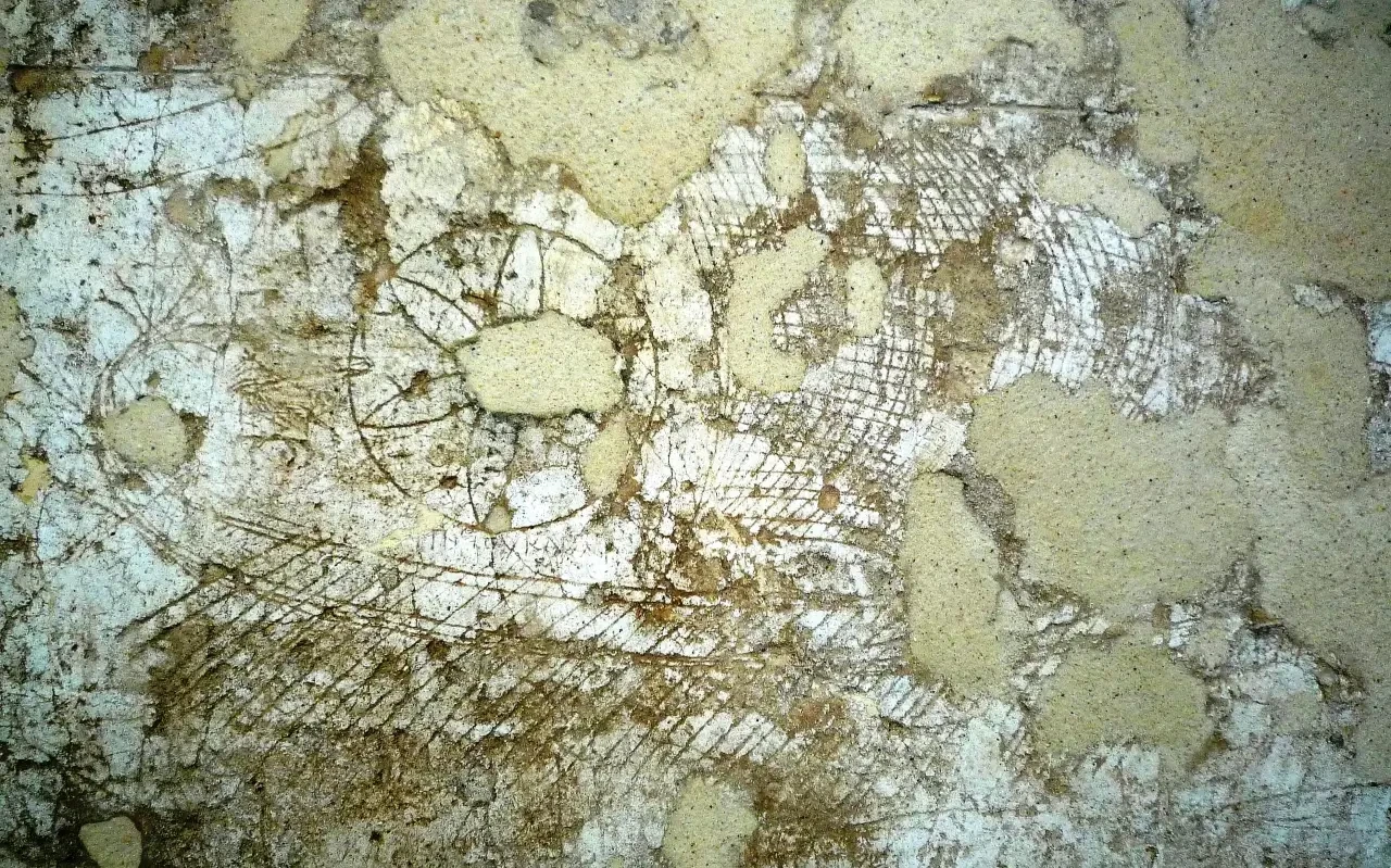 Это граффито, вероятно, изображает очень большой корабль, так как на нём видно 50 вёсел с одной стороны. Впервые оно было скопировано капитаном Карлини в 1930-х годах и сейчас хранится в Археологическом музее Делоса, где и была сделана эта фотография в 2015 году