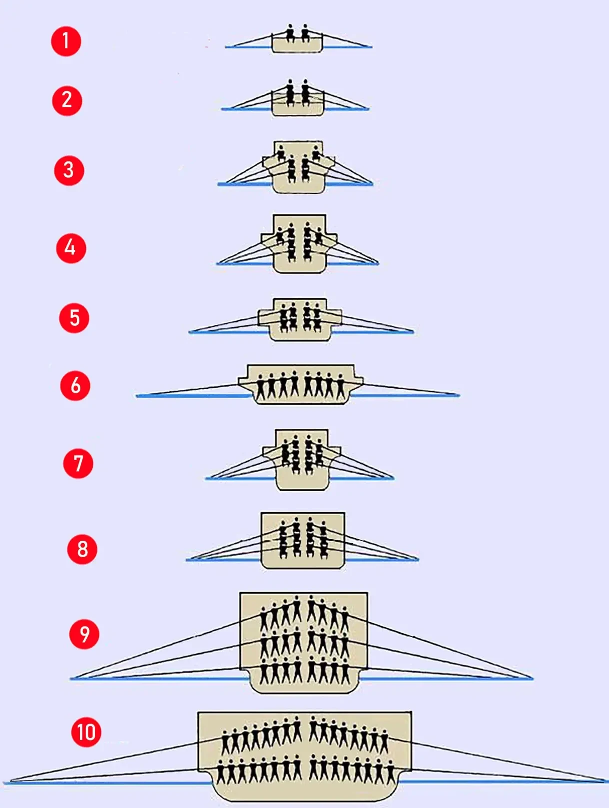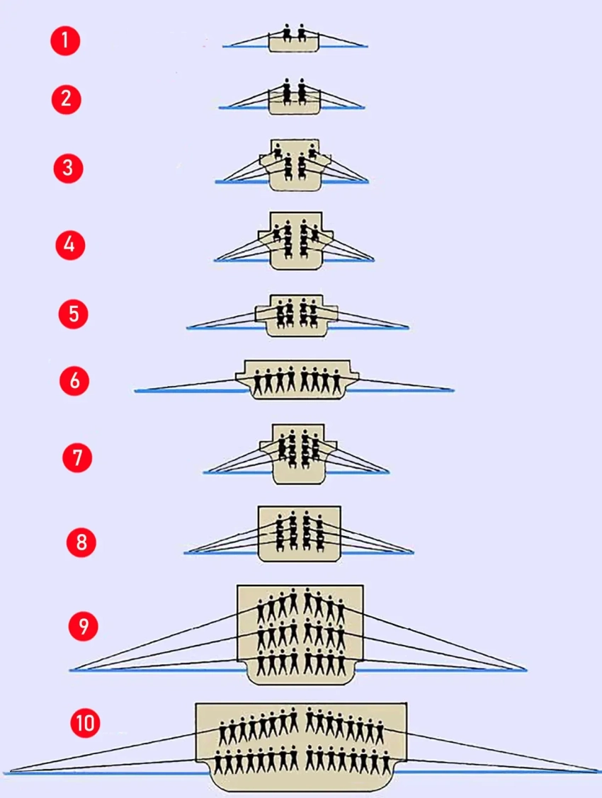 Схема расположения гребцов на многовесельных кораблях древности: 1 –пентеконтер или монера, 2 – бирема, 3 – трирема, 4 – квадрирема тип А, 5 – квадрирема тип Б, 6 – квадрирема тип В, 7- квинкерема, 8 – септерема (ранний тип), 9 – «двенадцарирядное судно», 10 – «шестнадцатирядное судно». Рис. А Шепса