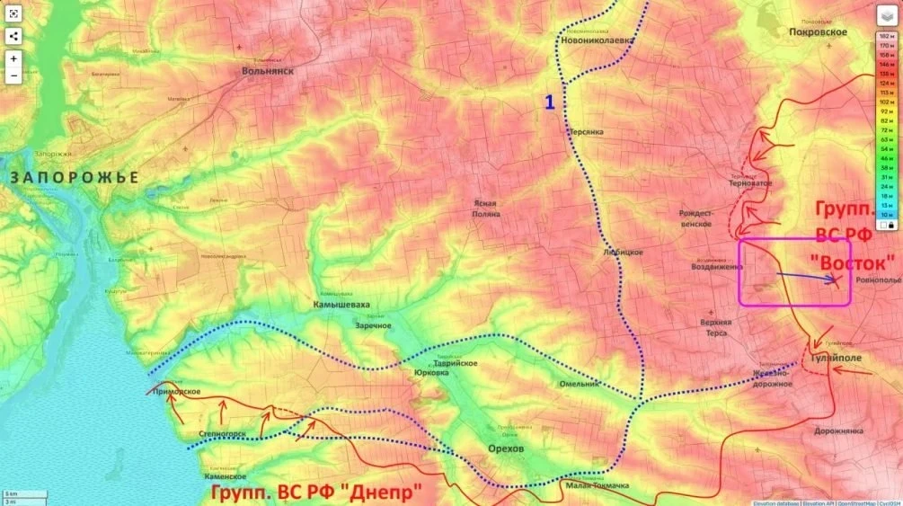 Параллельно на Гуляйпольском участке действует группировка «Восток». После занятия Гуляйполя удары наносятся южнее Терноватого, через район Риздвянки в направлении Любицкого. В самом Терноватом идут штурмовые действия сразу с нескольких направлений. Общая логика операции, как отмечает обозреватель, сводится к созданию оперативного окружения Орехова с северо-запада и юга.