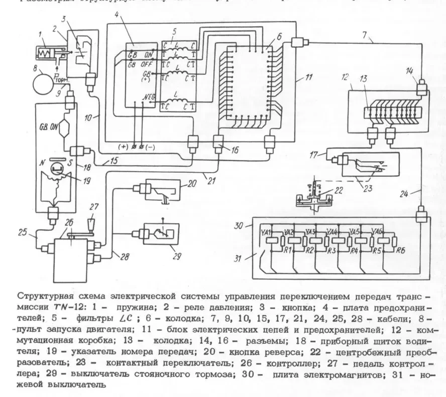 Электромагниты УА1–УА6 управляют гидравлическими золотниками, включающими тормоза коробки передач соответственно: Т1, Т2, Т3, Ту.п, Тз.п, Тз.х. Каждая передача включается двумя тормозами. Электромагниты размещены на общей плите 30, которая установлена на золотниковой коробке. Цепи питания электромагнитов проложены в трубах, залитых компаундом, с целью уменьшения искрения контактов коммутирующих устройств контроллера. Параллельно обмоткам электромагнитов включены резисторы R1–R6. Электромагниты, резисторы, подсоединительные клеммы находятся в масляной среде.