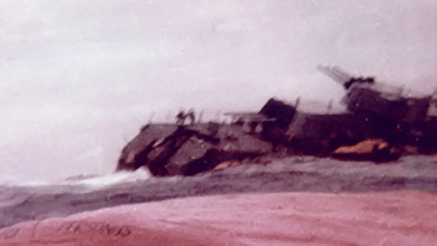 Тонущий «Бельграно» с другого ракурса. Качество так себе, но на корме видно двух человек: это капитан 1 ранга Эктор Бозо и старшина Рамон Баррионуэво, готовящиеся покинуть корабль последними