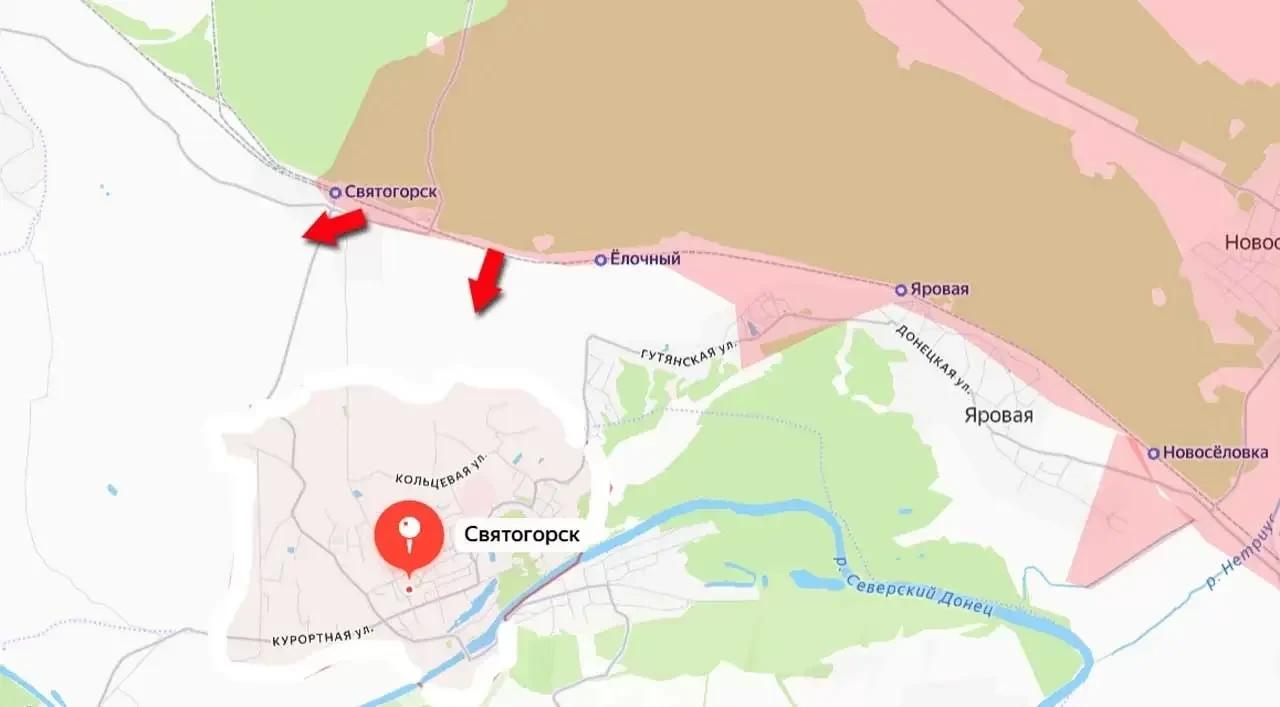 Российские войска развивают наступление на севере Донецкой Народной Республики. Поступают сообщения о том, что в результате наступательных действий Вооружённые силы РФ прорвались к северу от Святогорска, выбив противника с территории ключевых станций. Речь идёт о станциях (ОП) Ёлочный и, собственно, Святогорск. Противник, понеся потери, отступает в городскую застройку.