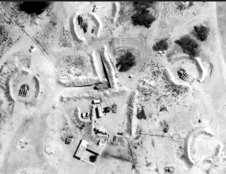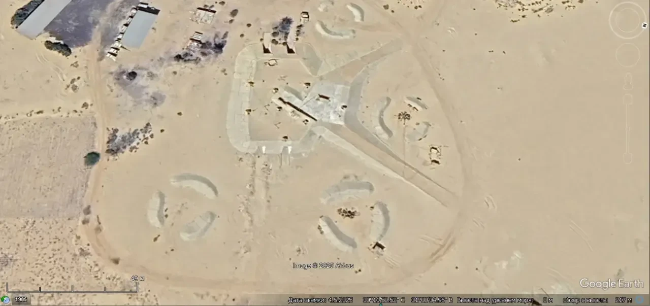 Спутниковый снимок Googlе Eаrth: позиция ЗРК С-125 в 12 км северо-западней Каира. Видно, что на позиции осталось две пусковых установки без ракет. Снимок сделан в апреле 2025 года