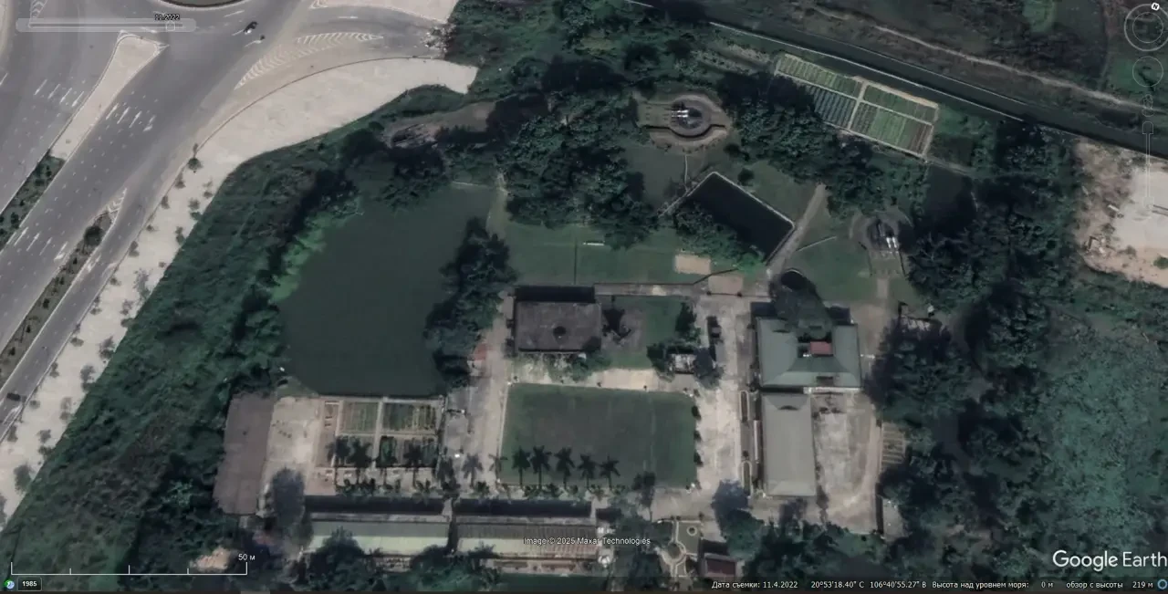 Спутниковый снимок Googlе Eаrth: позиция ЗРК С-125М1А в восточной части Хайфона. Эта позиция примечательна тем, что станция наведения и пусковые установки окружены прудами, ЗУР на ПУ нет. Снимок сделан в июле 2025 года