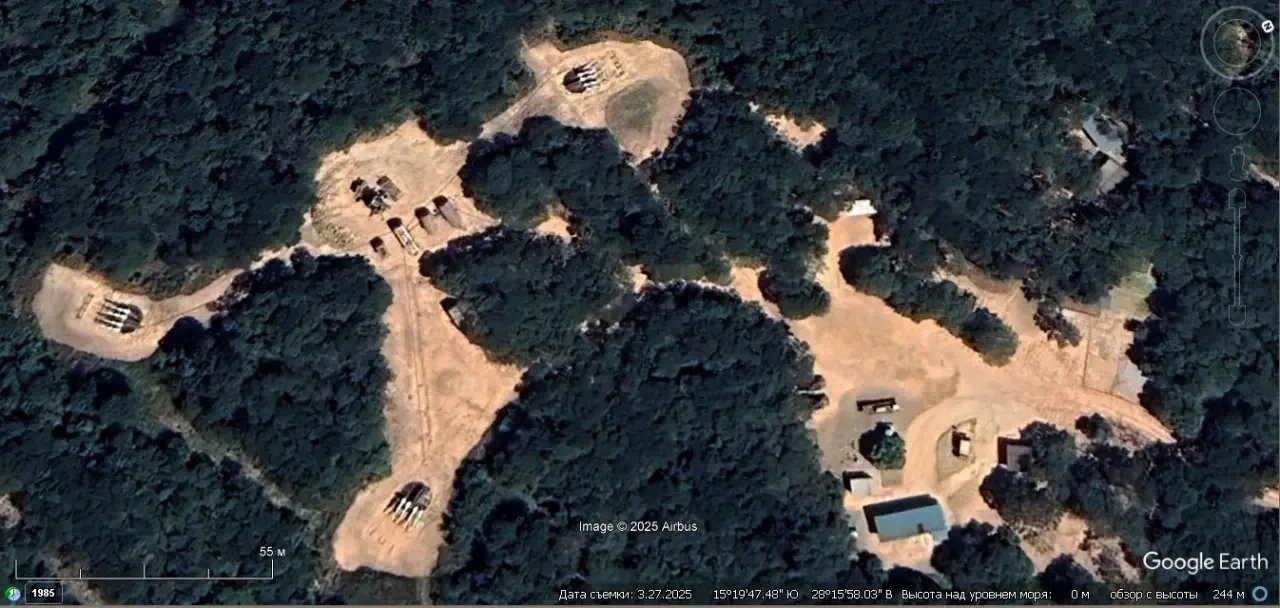Спутниковый снимок Googlе Eаrth: позиция ЗРК С-125М1А в 15 км к югу от Гаваны. Из двух пусковых установок развёрнутых на позиции только одна снаряжена двумя ракетами. Снимок сделан в марте 2025 года