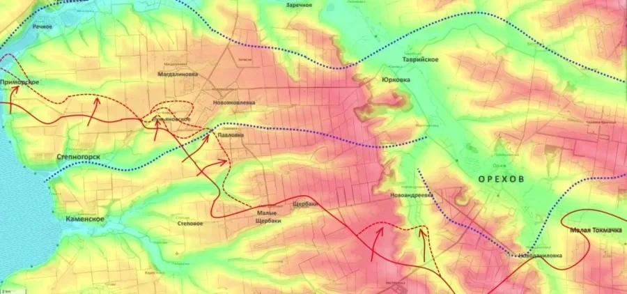 На Ореховском участке продолжается планомерное выдавливание украинских подразделений в районе Белогорья и Малой Токмачки. Командование, как отмечает обозреватель, стремится занять высоты восточнее Орехова, пользуясь тем, что основные силы противника сосредоточены на удержании населённого пункта Железнодорожное. Такой манёвр может создать условия для начала штурма города ещё до подхода основных сил группировки «Восток».