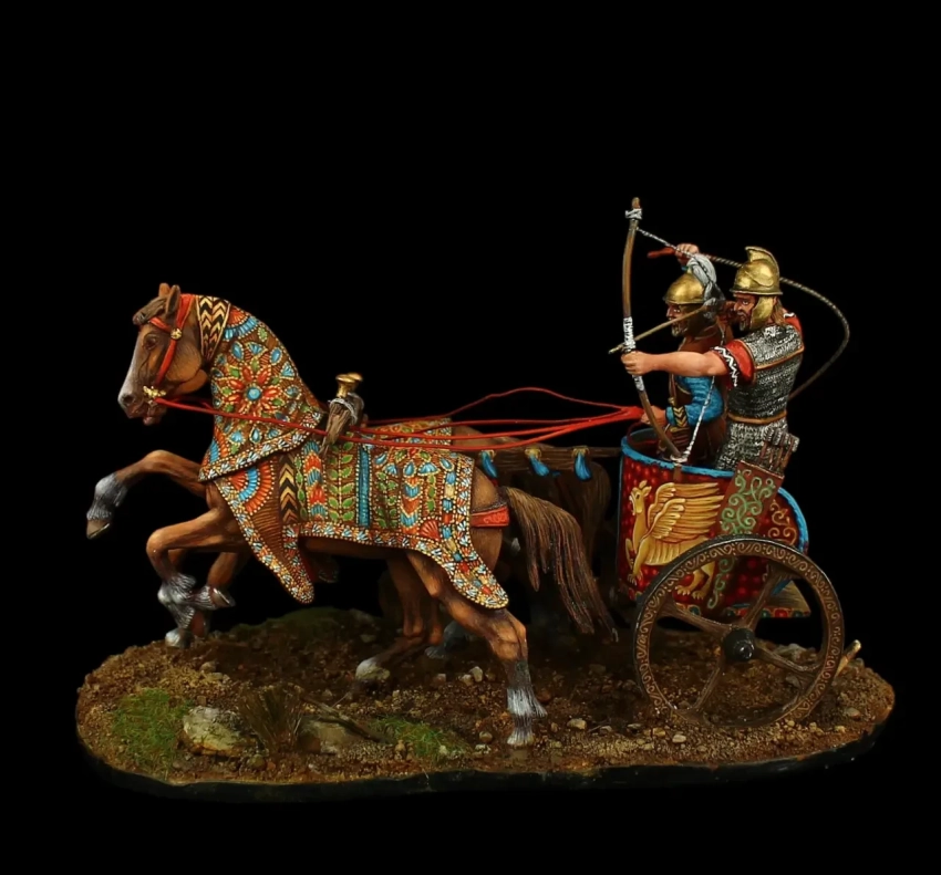 На рубеже XIII–XII веков до н. э. греками также использовались боевые колесницы: так называемая бига, запряжка из двух коней, в которой находилось два воина, один из которых был вооружён круглым щитом и парой копий. Соответственно, колесница с тремя лошадьми называлась трига, а та, в который их было четыре – квадрига. Колесный бандаж делался из железа. Когда колесницы не использовались, колёса с них в целях лучшей сохранности снимались. Поскольку образы «Илиады» и «Одиссеи» в Греции с течением времени постоянно трансформировались в сторону современности, нет ничего удивительного в том, что их героев греки и намного позднее изображали в доспехах V–IV вв. до н. э. А значит, набор фигурок колесницей фирмы «El Viejo Dragon» вполне допустим!