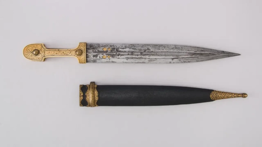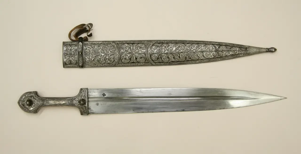 Кавказский кинжал – традиционное оружие горцев и принадлежность их национального костюма, изготовленный в селении Кубачи в Дагестане. Ок. 1818–1819 гг. Материалы: сталь, серебро, чернь, дерево. Длина: 55,88 см