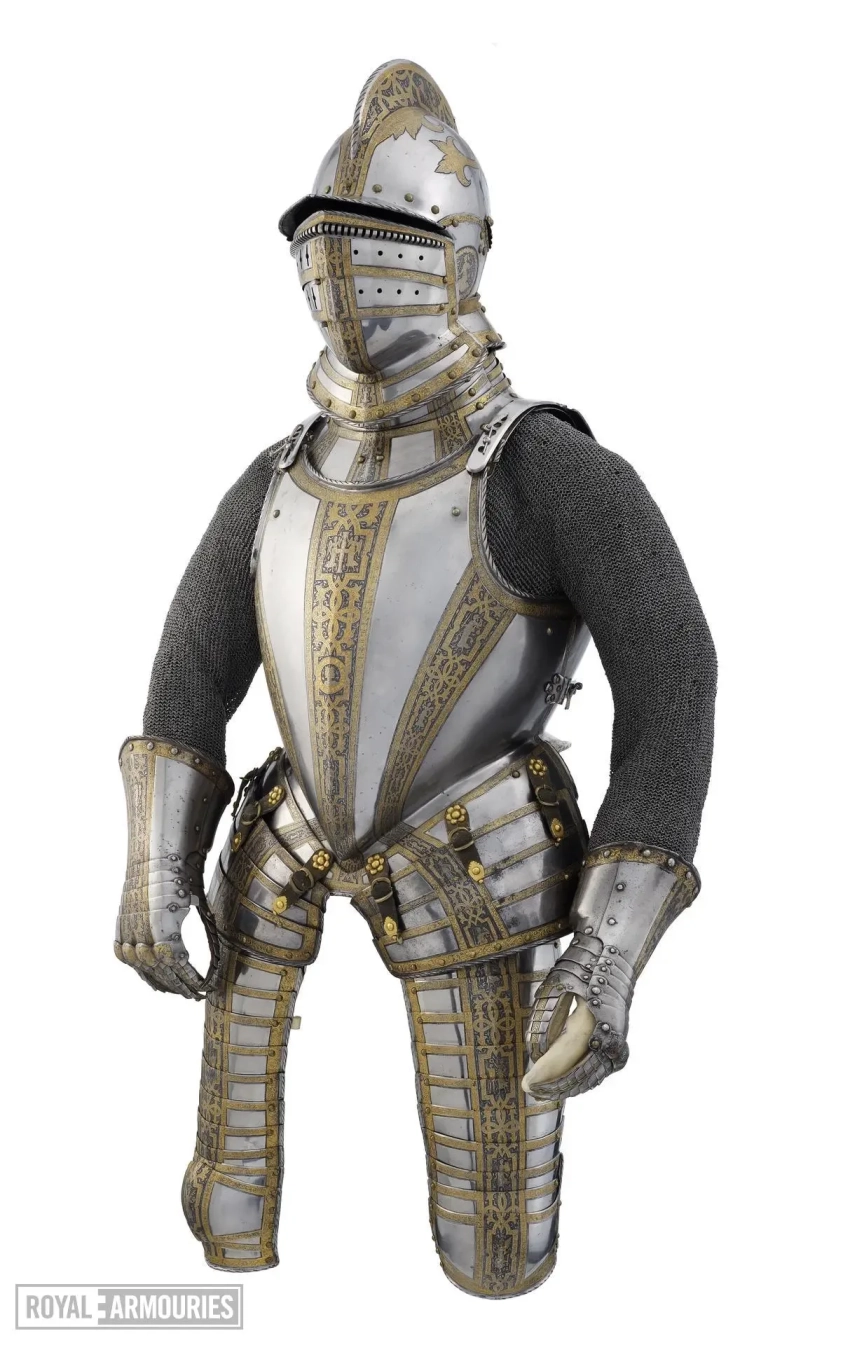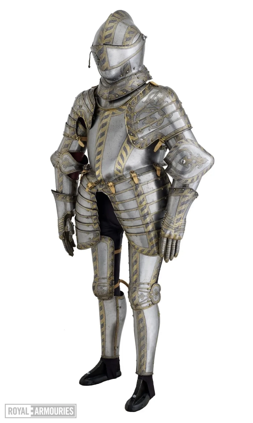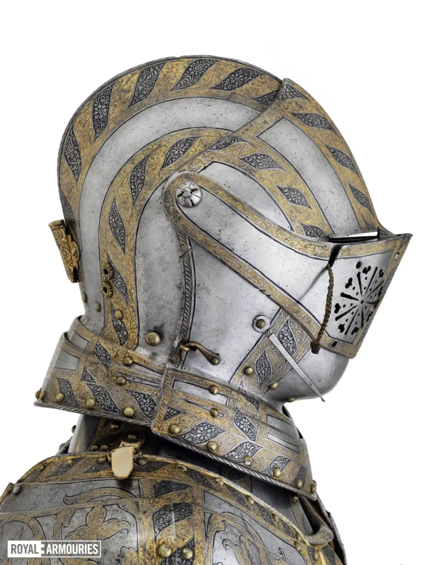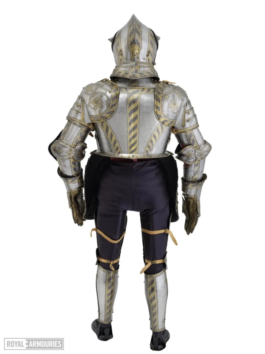 Впрочем, чтобы он там ни написал, важно то, какой все-таки доспех он для себя заказал. Состоит он из шлема бургонет (бургиньот); буффа; мориона; горжета; нагрудника; спинки; правой набедренной пластины; левой набедренной пластины; двух латных перчаток; и кольчужных рукавов. Доспех был просто, но богато украшен золочеными полосами с резной гравировкой растительными узорами и мифологическими фигурами на чеканном фоне, выполненном в технике «ячменного зерна». Поскольку это были доспехи не только всадника, но и его коня, то есть это был латный гарнитур, в них входили металлические накладки для седла и полушаффрон (неполная латная защита головы лошади).