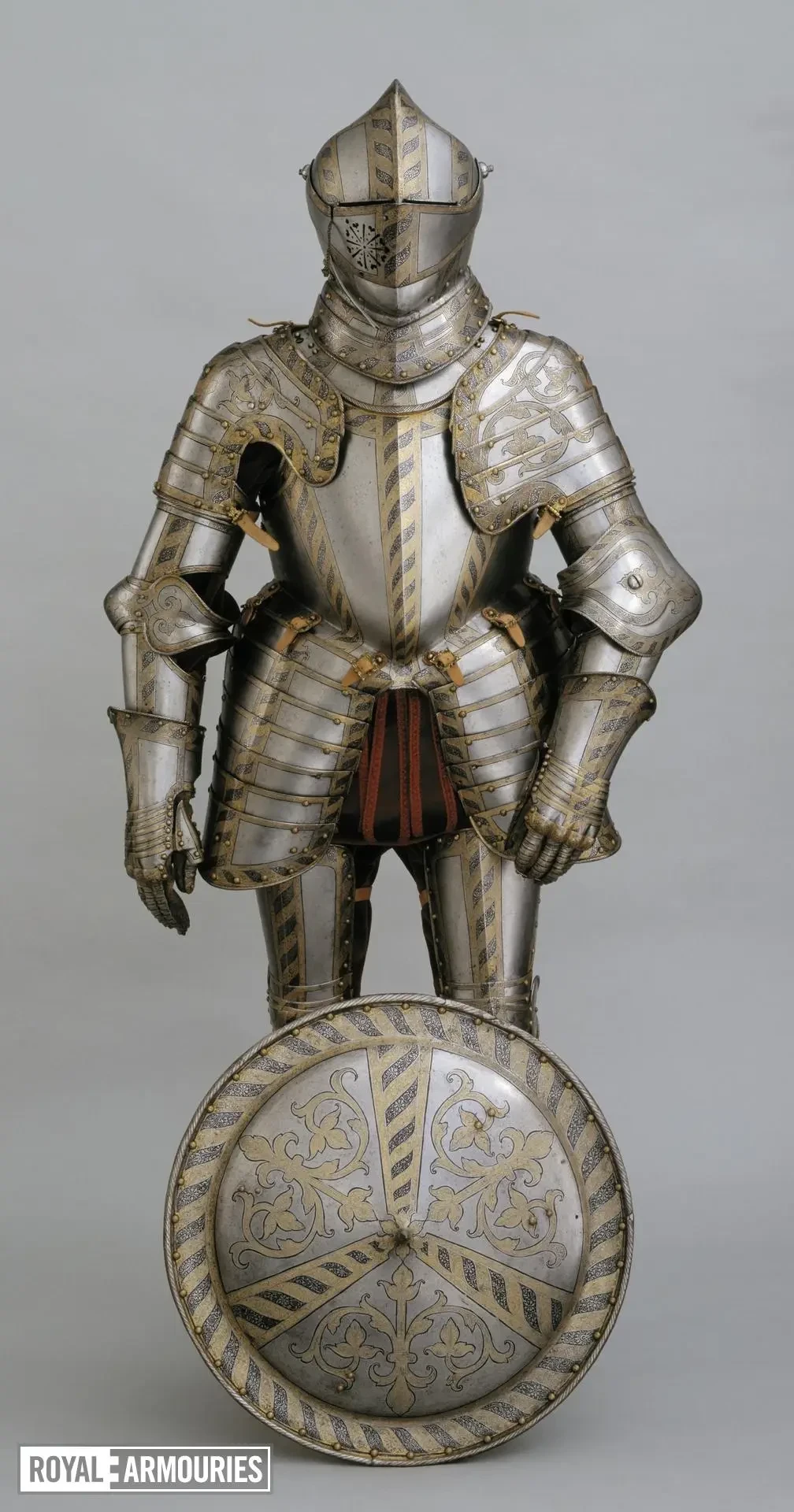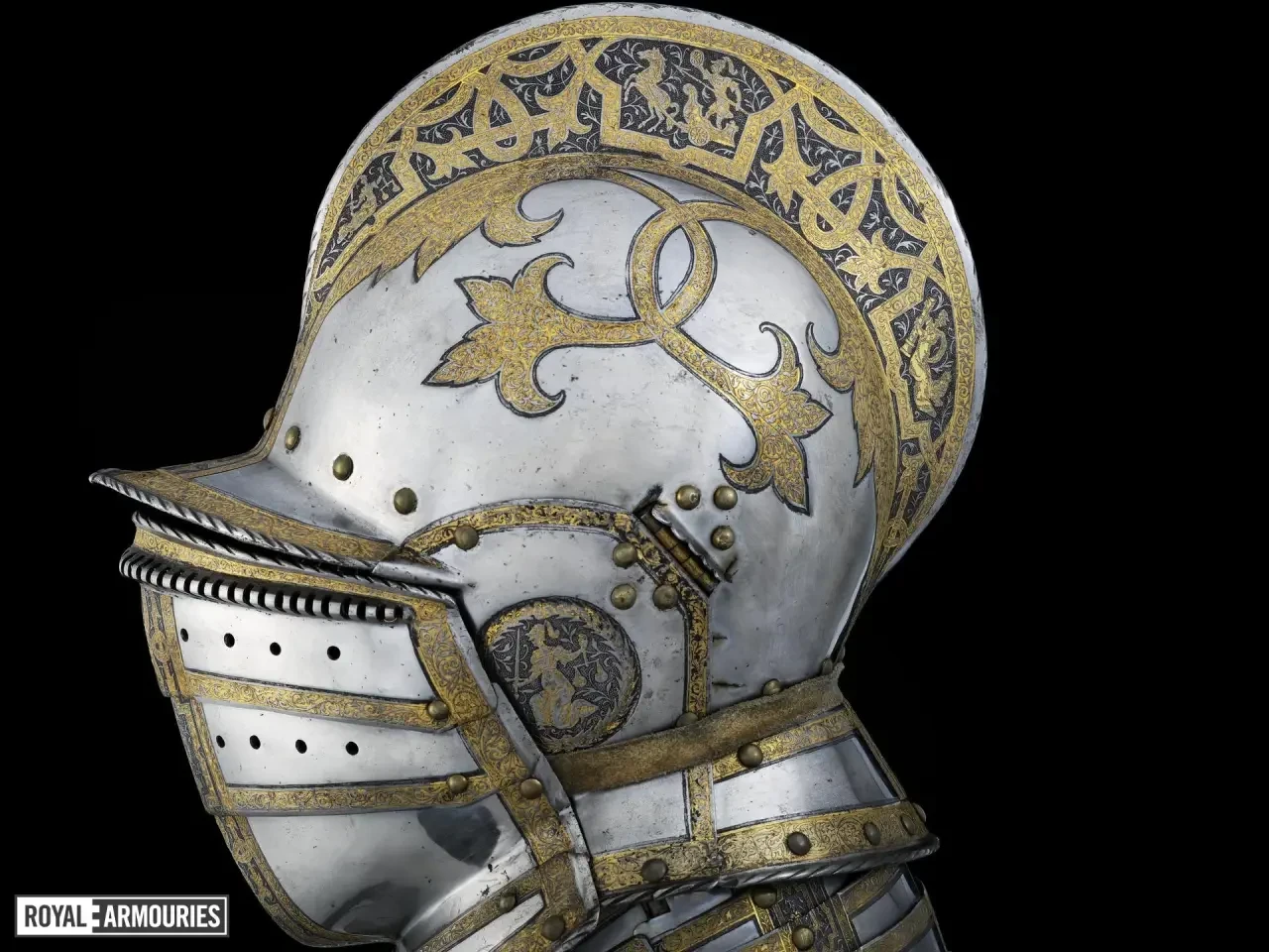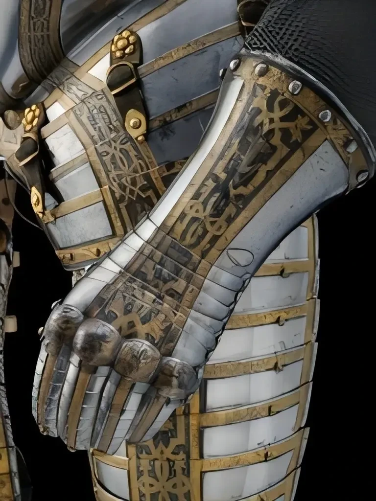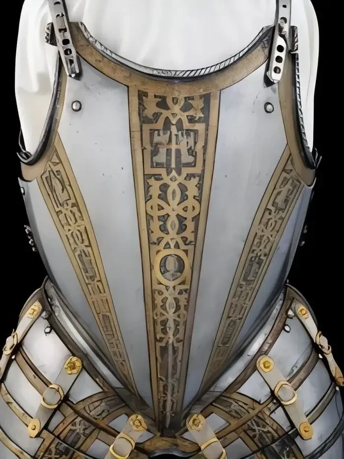 Впрочем, чтобы он там ни написал, важно то, какой все-таки доспех он для себя заказал. Состоит он из шлема бургонет (бургиньот); буффа; мориона; горжета; нагрудника; спинки; правой набедренной пластины; левой набедренной пластины; двух латных перчаток; и кольчужных рукавов. Доспех был просто, но богато украшен золочеными полосами с резной гравировкой растительными узорами и мифологическими фигурами на чеканном фоне, выполненном в технике «ячменного зерна». Поскольку это были доспехи не только всадника, но и его коня, то есть это был латный гарнитур, в них входили металлические накладки для седла и полушаффрон (неполная латная защита головы лошади).