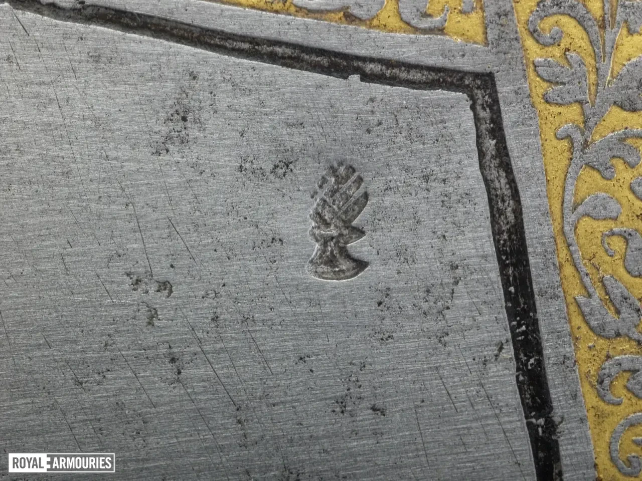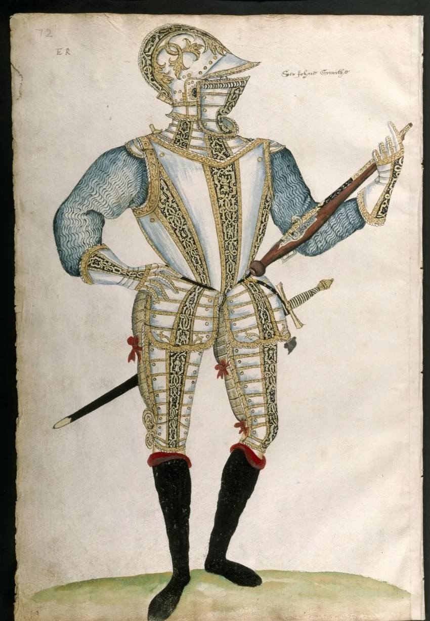 Коллекция Старого Тауэра. Сэр Джон Смайт завещал эти доспехи королю Якову I в 1607 году. Потом они в 1611 году находились в Гринвиче и были доставлены в Оружейную палату Тауэра в 1649 году. В Виндзорский королевский замок их отправили в 1686 году, а в 1914-ом возвратили в Тауэр. Интересно, что нагрудник кирасы этого доспеха был изображен на портрете фельдмаршала Джорджа Уэйда (1673-1748) работы Иоганна ван Динста (1695-1757), который был продан на аукционе Sotheby's 9 апреля 2001 года.