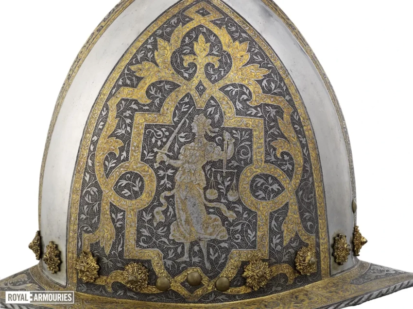 Изысканный позолоченный щит, изготовленный для сэра Джона Смайта, ок. 1575–1585. На этом искусно украшенном щите внутри изображены позолоченные олицетворения добродетелей: удачи, справедливости и стойкости. В настоящее время хранится в Метрополитен-музее