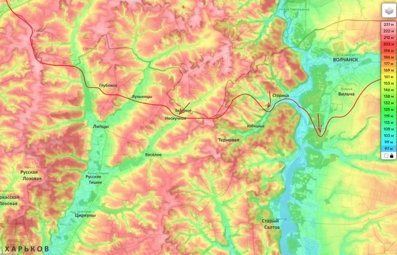 "Из района Вильчи наши подразделения пытаются двигаться на юг, чтобы выйти во флаги Белому Колодцу. Задача, очевидно, выйти на Большой Бурлук и таким образом, нанося удары во флаги и по центру, рассечь группировку противника и разгромить её, чтобы дальше широким фронтом уже зайти в глубину Харьковской области и развивать наступление", - отметил блогер.