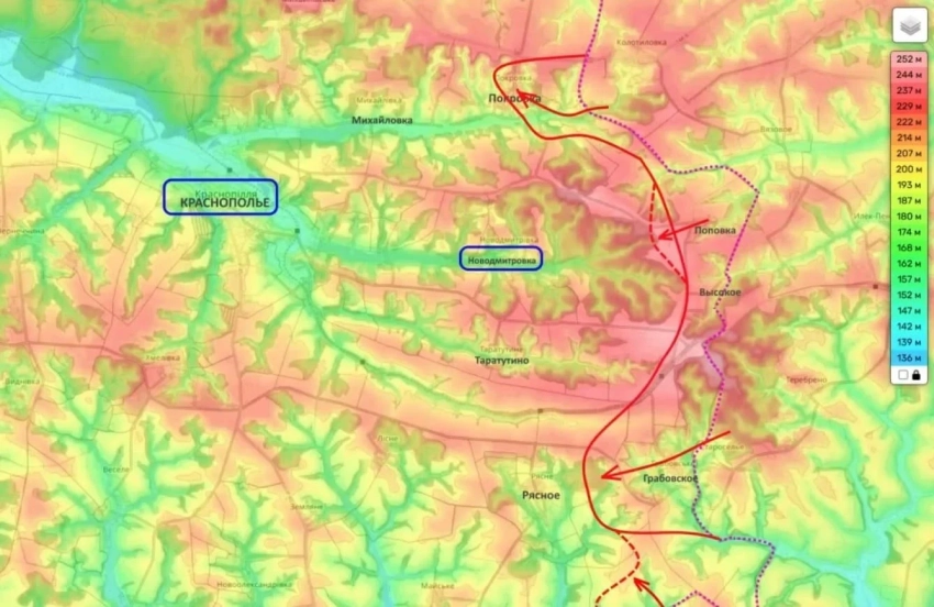 Коц полагает, что дальше продвижение может пойти в сторону Рясного, Таратутино и Новодмитровки. Если получится занять эти населенные пункты, позиции станут устойчивее. Главный практический смысл здесь в том, что российские подразделения смогут вплотную подойти к трассе Р45. Эта дорога соединяет Сумы и Харьков, и теперь она либо окажется под постоянным обстрелом, либо будет полностью перекрыта.