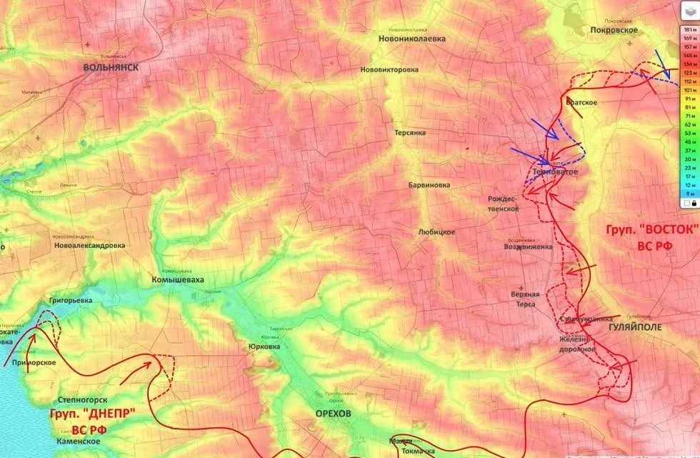 Тем временем группировка «Восток» в районе Гуляйполя, как отметил Подоляка, продолжает атаковать по направлению к Верхней Терсе.