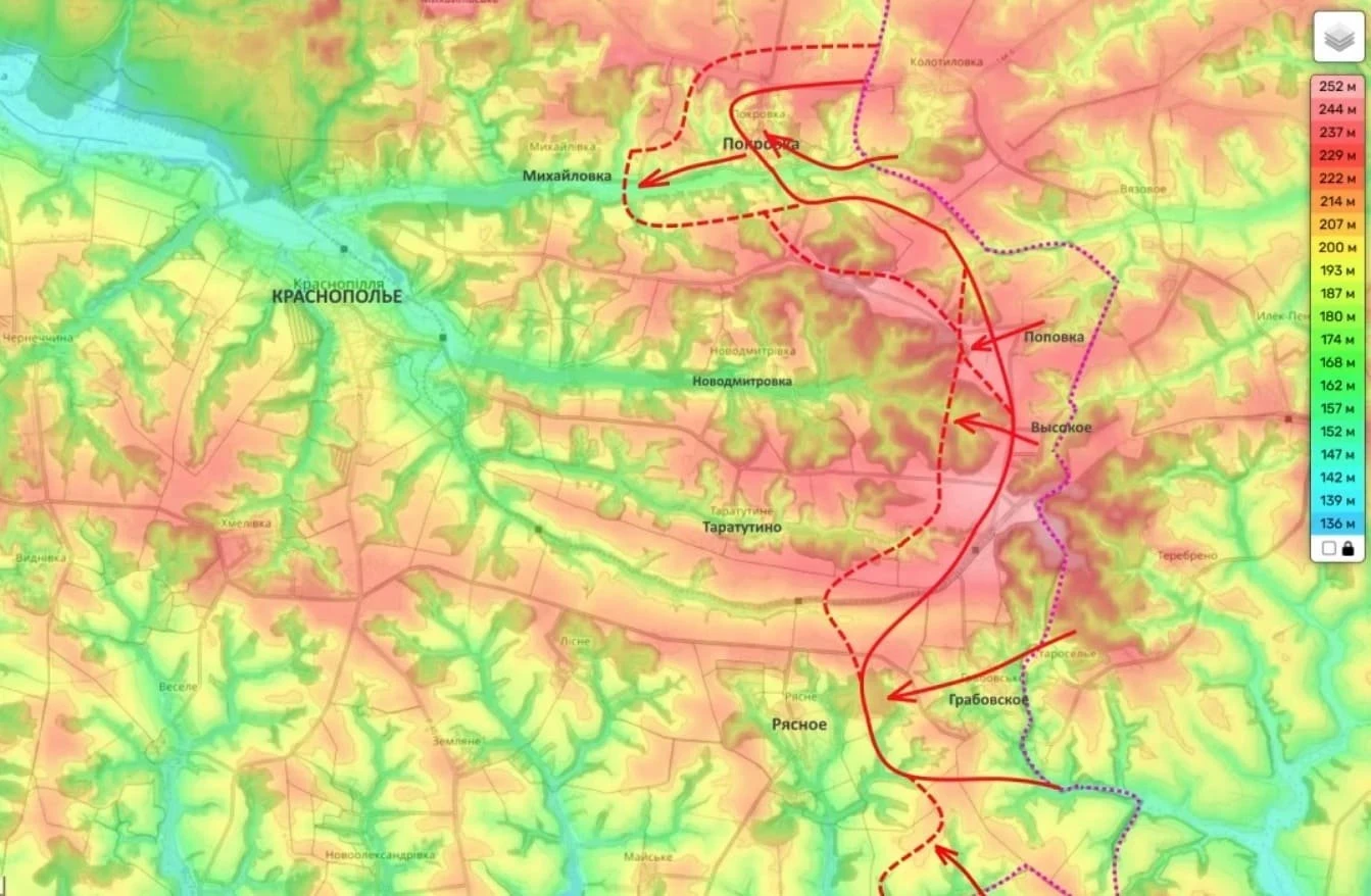 По его прогнозам, скоро могут начаться серьезные столкновения за саму Новодмитровку и соседнее село Таратутино. Если удастся закрепиться на этом участке, появится возможность начать полноценный штурм Краснополья. Параллельно с этим есть продвижение в районе Корчаковки - это уже севернее областного центра.