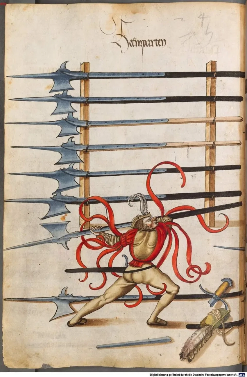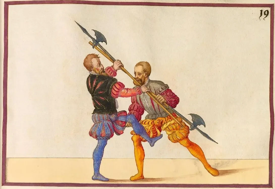 Поединок на алебардах. Илл. из пособия по фехтованию — «Фехтовальной книги» Пауля Гектора Майра (1542—1544). Саксонская государственная библиотека. Дрезден
