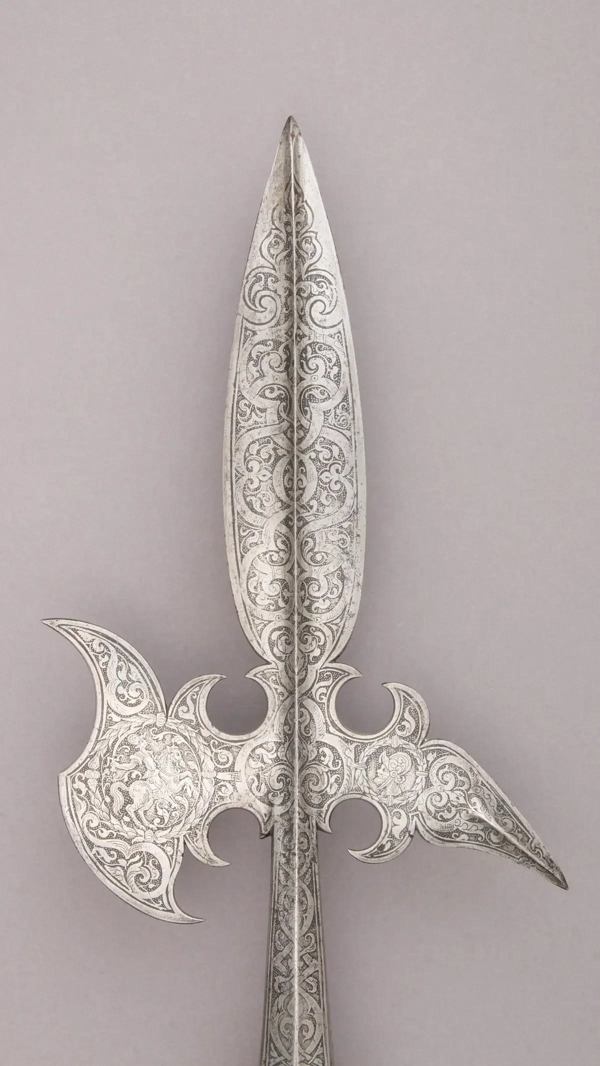 Алебарда из коллекции оружия и доспехов Башфорда Дина в Метрополитен-музее. Украшениями этой парадной алебарды являются травленые узоры и изображение внутри медальонов. Больший медальон содержит изображение всадника с саблей восточного типа, но в шлеме морион, меньшего размера медальон на крюке содержит изображение головы бородатого воина, опять-таки в шлеме морион