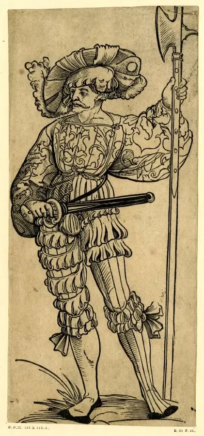 Ландскнехт, вооруженный алебардой. Илл. Бартоломеуса Фрейслебена из «Арсенальной книги» Максимилиана I (1502 г.). Баварская государственная библиотека. Мюнхен
