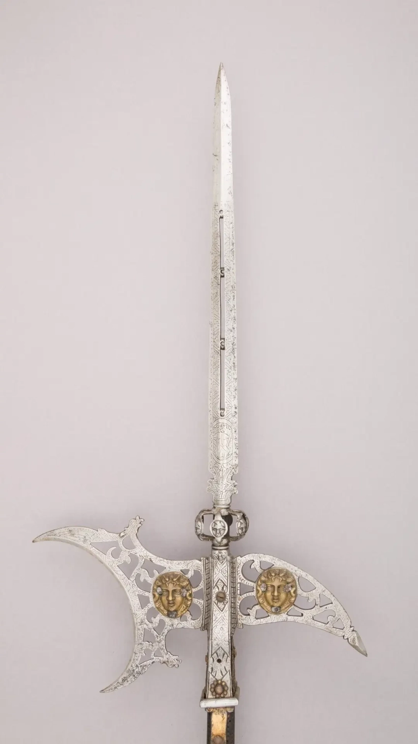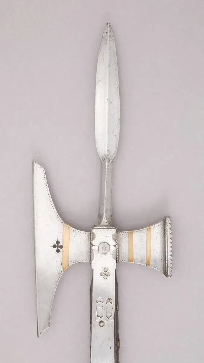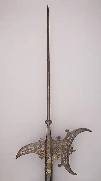 Итальянская алебарда, ок. 1560. Материал: сталь, дерево, золото. Длина 266,9 см. Длина головки 80 см. Ширина 39,3 см. Вес 2830 г. Метрополитен-музей, Нью-Йорк