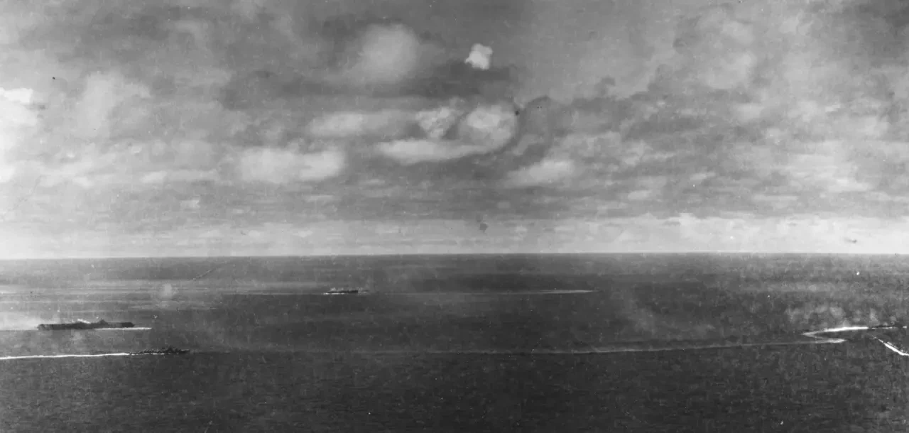 Вид на место проведения операции «Тэн-Го», 7 апреля 1945 года. Эсминец «Касуми» лежит на боку после попадания бомбы, «Хацусимо» и «Фуюцуки» находятся позади него, а за ними виден линкор «Ямато», накренившийся на левый борт и горящий в средней части корпуса.