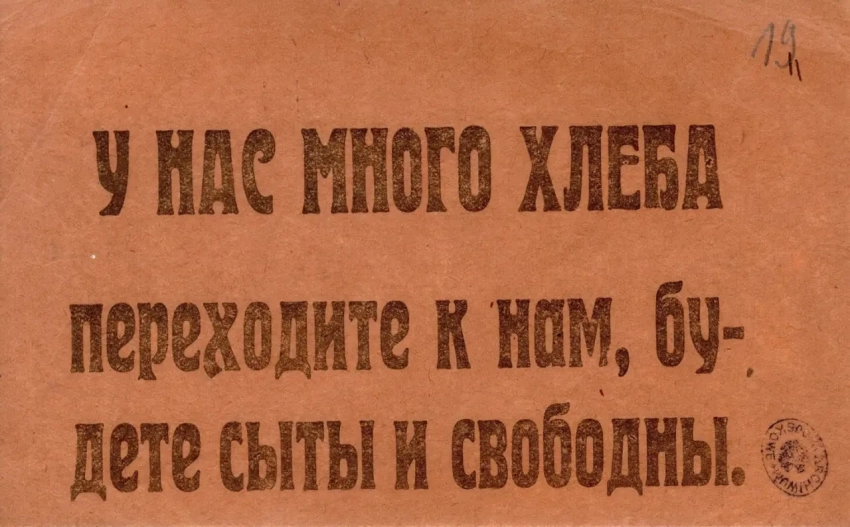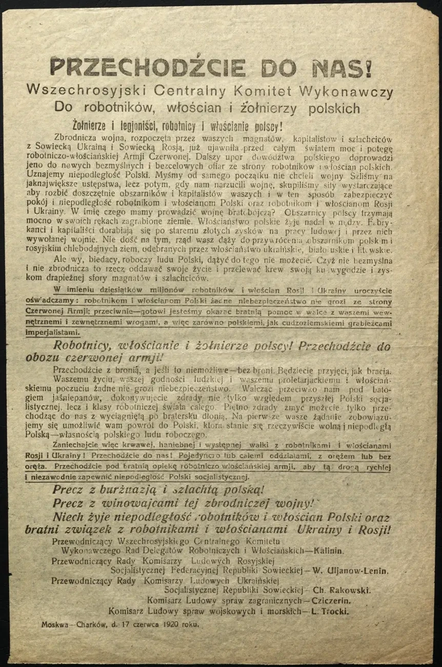 Листовка c обращением ВЦИК к польским рабочим, крестьянам и солдатам «Переходите к нам!». Архив РГАСПИ: КП-104049 ПМ-3375.