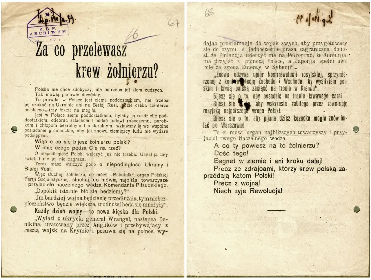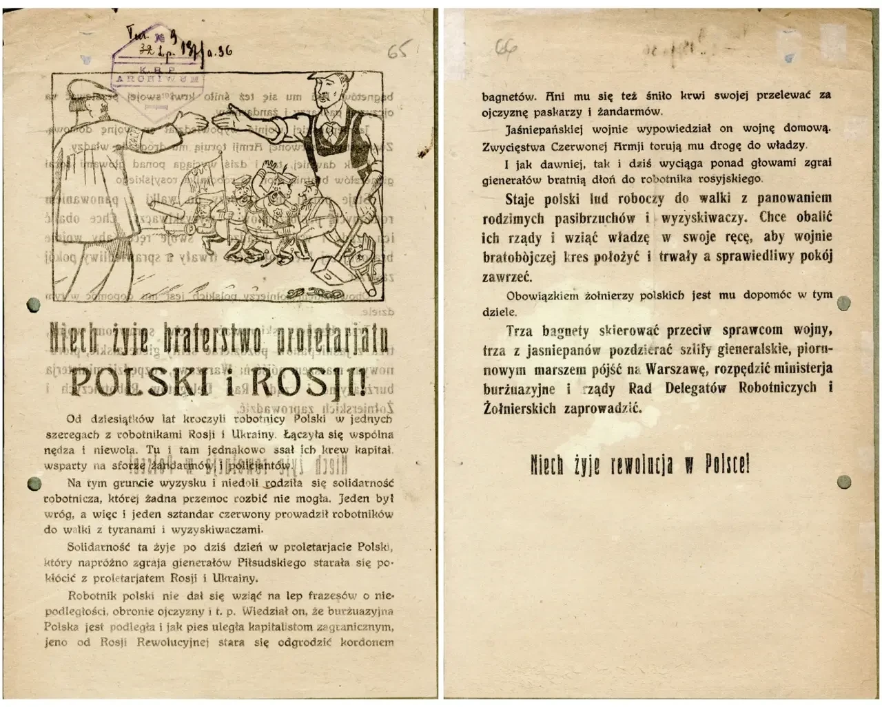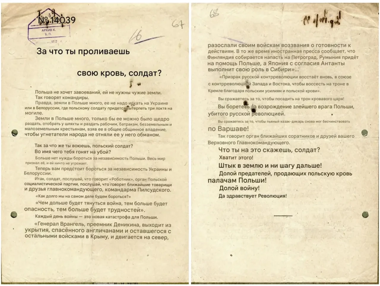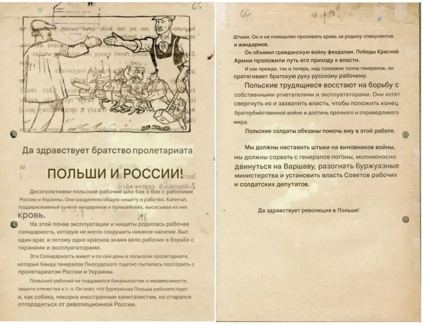 Листовка политотдела РВС N-ской армии с обращением к польским солдатам не принимать участия в войне, выгодной лишь капиталистам и панам. Архив РГАСПИ: КП-104049 ПМ-3429.