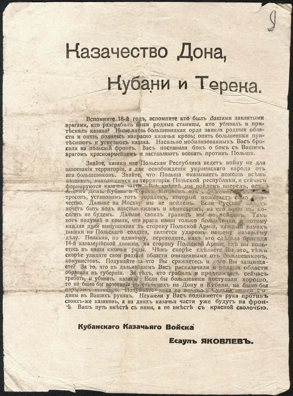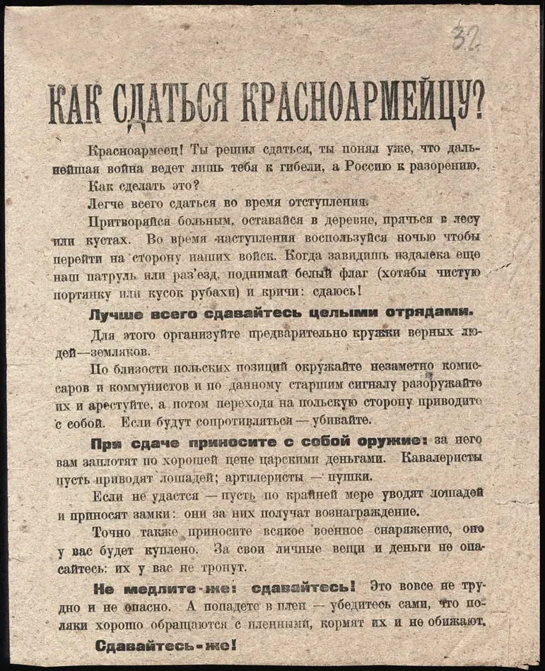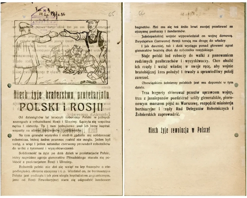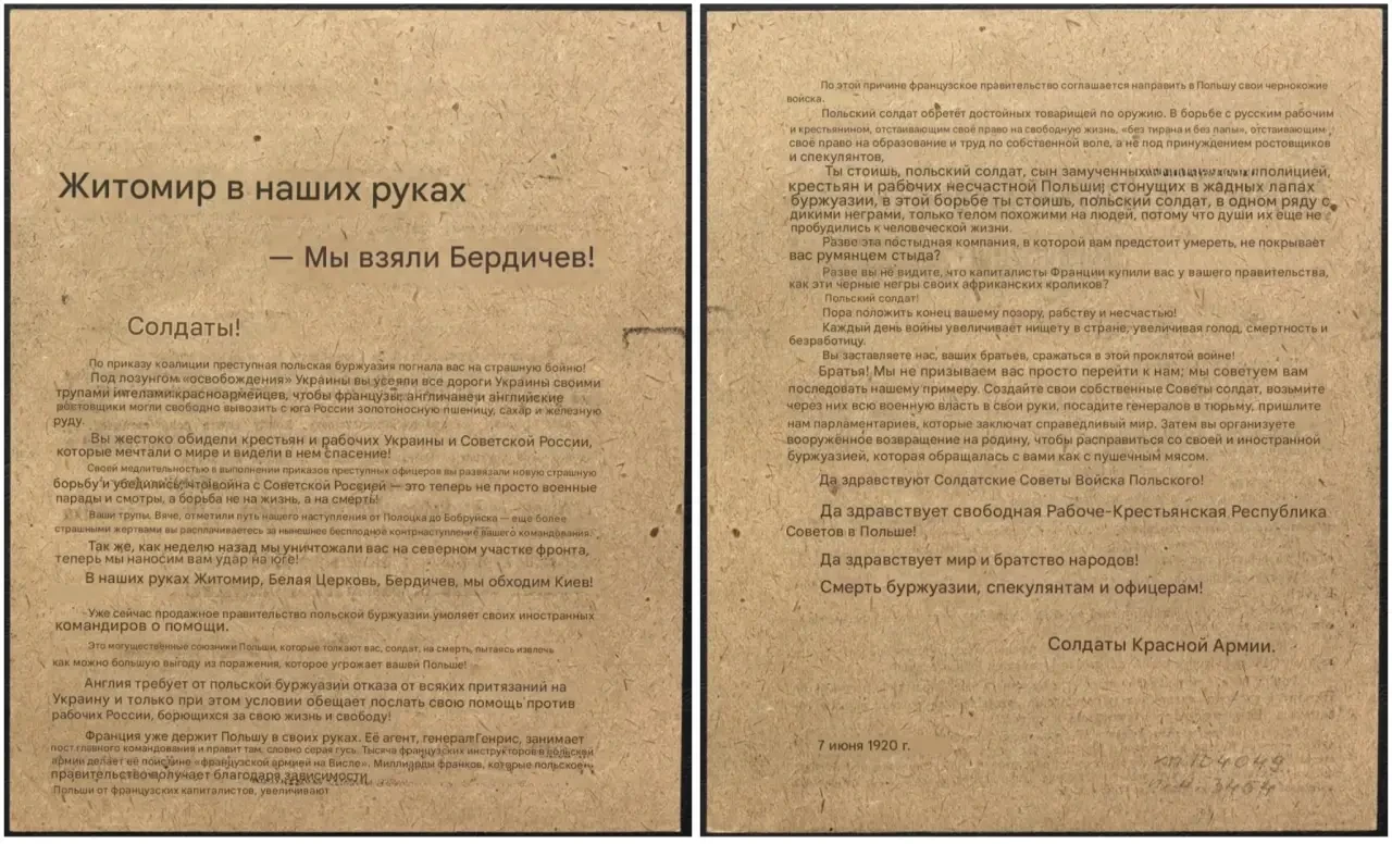 Листовка политотдела РВС Западного фронта с обращением к польским солдатам, воюющим против Красной Армии, не поддаваться антисоветской пропаганде и переходить на сторону красных. Архив РГАСПИ: КП-104049 ПМ-3230.