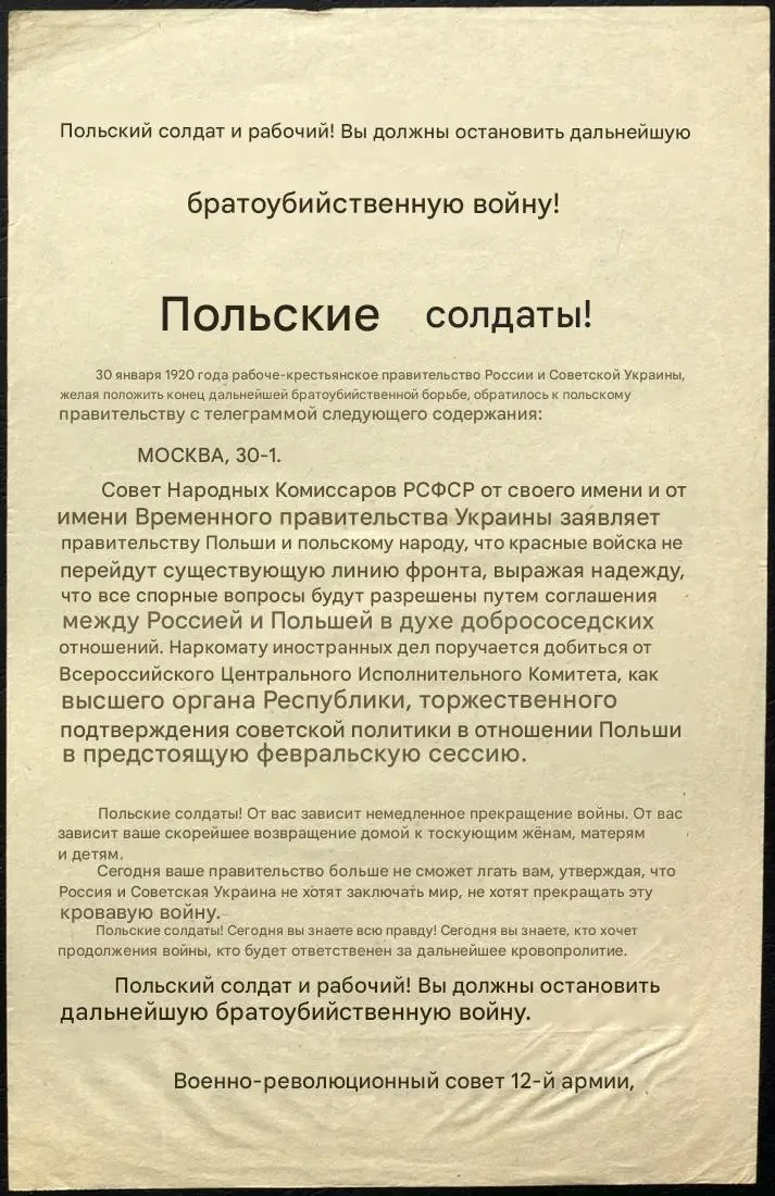 Листовка РВС 12-й армии с обращением к польским солдатам прекратить братоубийственную войну и выдержками из обращения СНК РСФСР к польскому правительству и народу. Архив РГАСПИ: КП-104049 ПМ-3419.