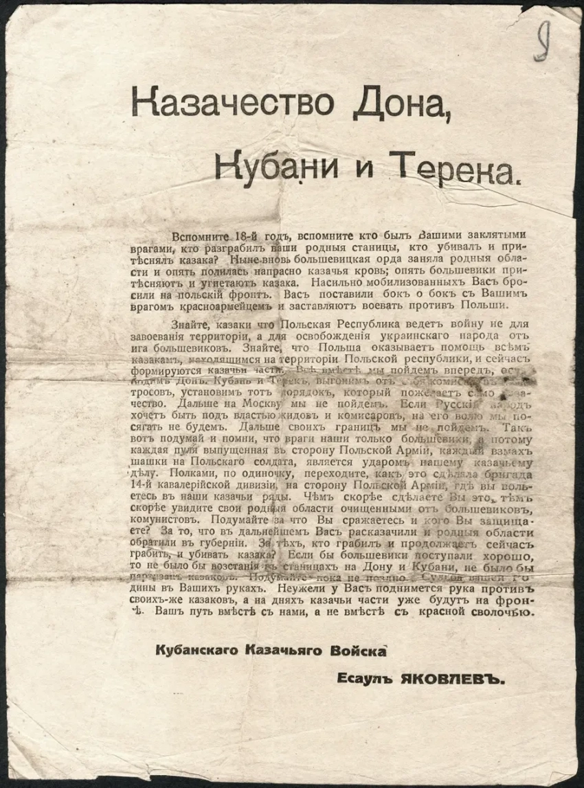 Листовка, обращающаяся к конкретным дивизиям и бригадам Красной Армии. Достаточно прогрессивный подход для того времени. Правда, пока что в листовках не содержится информация о потерях и трудностях, с которыми столкнулись данные военные формирования. Листовка доносит общие обращения к казачеству.