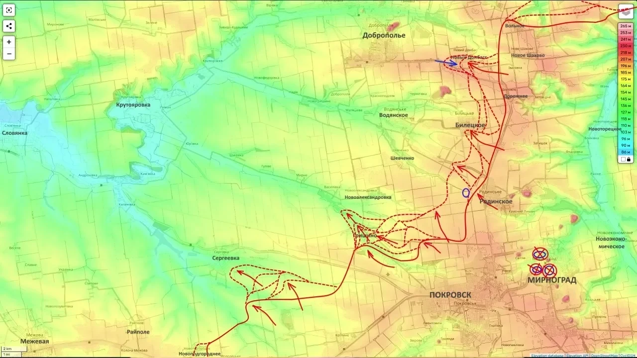 Военные аналитики подтверждают масштабное наступление в районе Доброполья. Российские силы развивают удар по принципу «клещей». Подразделения наступают на север в сторону Шевченко и Светлого, пытаясь зайти в глубокий тыл группировке ВСУ, одновременно сжимая кольцо с юга, где идут встречные бои у Вольного и южнее Кучерова Яра.