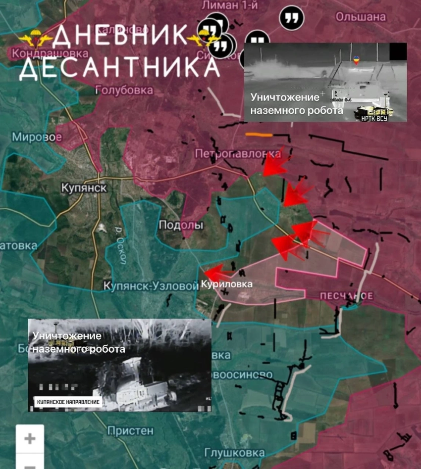 В районе Куриловки также есть продвижение, нам удалось продвинуться севернее Песчаного вдоль дороги на Купянск, помимо этого, продвинулись на Куриловку, большая часть которой под нашим контролем. Таким образом, наши войска продвигаются к восточной части Купянск-Узлового, который является основным логистическим центром ВСУ на данном участке;