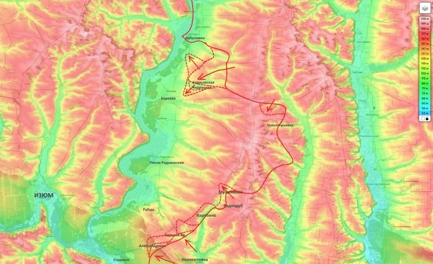 На Боровском направлении активные боевые действия идут в двух локациях. В частности, они продолжаются в районе Богуславки и южнее, по направлению к Рубцам российские войска стремятся через Коровий Яр и Александровку выйти к реке Оскол.