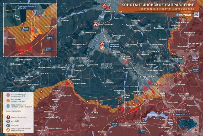 В Константиновке в Донецкой Народной Республике продолжаются ожесточенные бои. Российские подразделения ведут бои в центральных районах города, одновременно пытаясь продвинуться в городскую черту со стороны поселка Бересток.