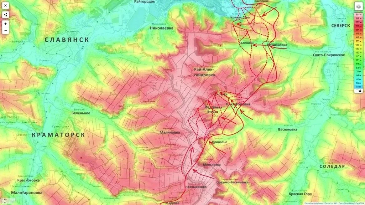 Расстояния на этой карте уже не выглядят абстрактными. До окраин Славянска от передовых позиций - чуть больше 18 километров, до Краматорска по прямой - около 20. И это не просто цифры на схеме. Это показатель того, насколько плотно сжимается дуга вокруг всей Славянско-Краматорской агломерации.