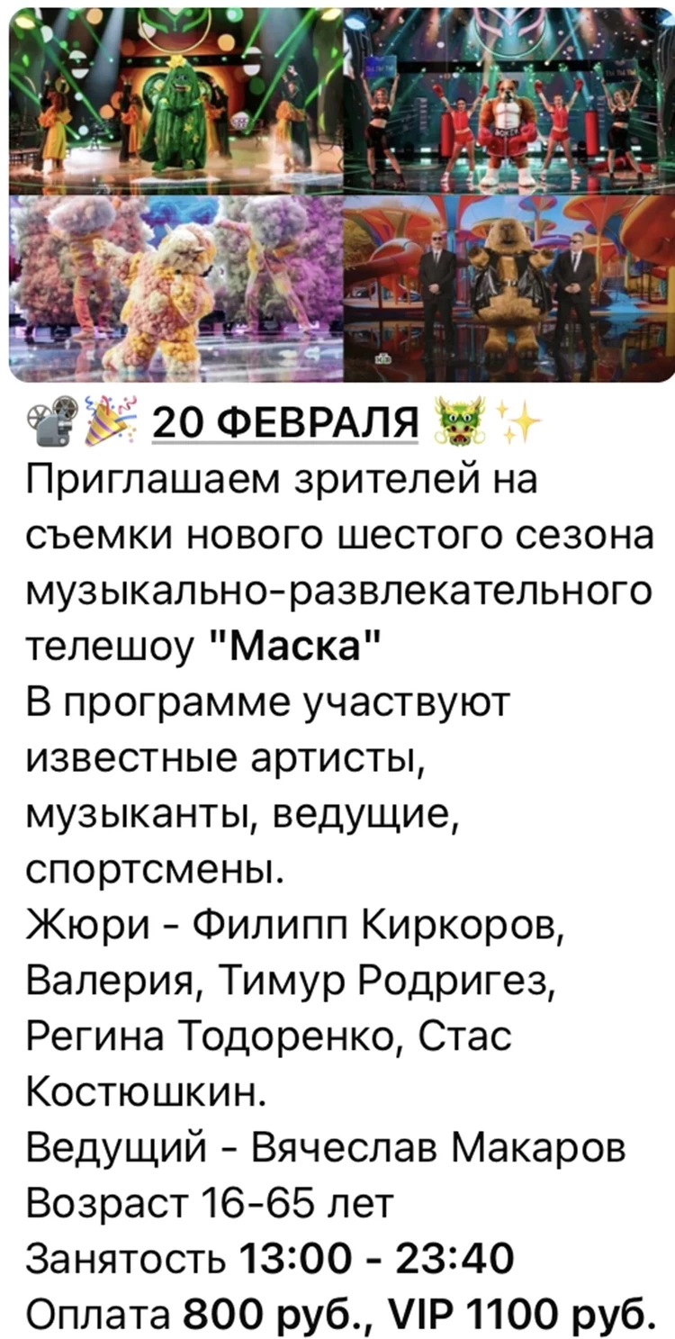Имейте ввиду, что иногда (редко) съемки заканчиваются очень поздно и такси массовке никто не оплатит. К примеру, 20 февраля снимают "Маску" (НТВ) - окончание заявлено в 23.40. Гонорар - 800 рублей. Возраст зрителей - от 16 до 50 лет. Ведущий "Маски" - Вячеслав Макаров. В жюри - Филипп Киркоров, Валерия, Тимур Родригез, Регина Тодоренко.