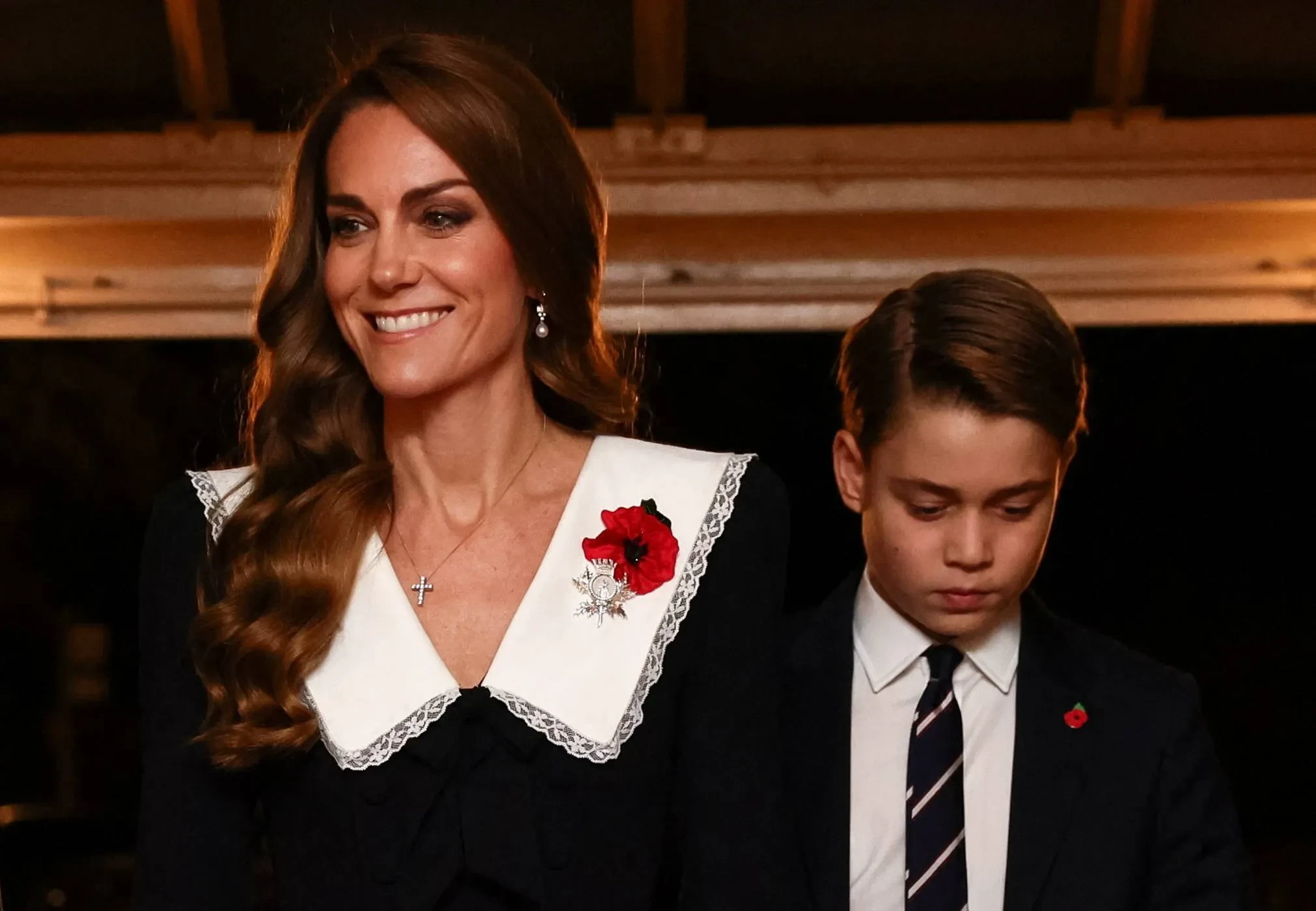 Принц Уильям в этом году не смог присутствовать на мероприятии (он возвращается домой из рабочей поездки в Бразилию), однако на концерт пришли его супруга, 43-летняя Кейт Миддлтон, и старший сын — 12-летний принц Джордж. На Кейт было чёрное длинное платье с белым воротником, по традиции украшенное брошью в виде красного мака — символом Дня памяти.